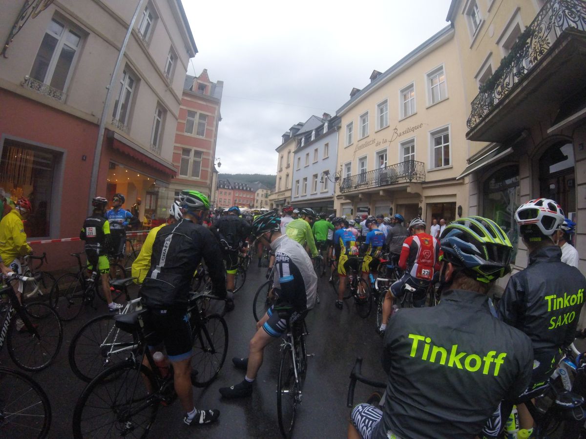 30 km vor Echternach setzt dann so heftiger Regen ein, dass ich den Scheibenwischer auf höchster Stufe betreiben muss. Um 7:45 Uhr komme ich an und begebe mich mit Überschuhen, Weste und Ärmlingen bekleidet zur Registrierung. Zum Start um 9:00 Uhr vom Marktplatz regnet es immer noch moderat.