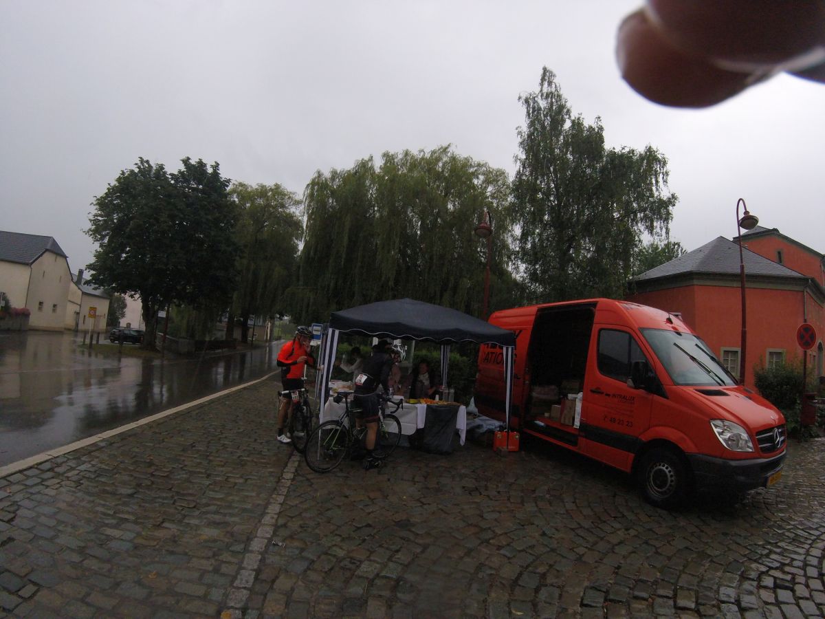 Dann stürzt weiter vorn ein Fahrer, als wir hinter der Kuppe der 4. Cote gerade wieder Fahrt aufnehmen. Die beiden Fahrer vor mir stürzen ebenfalls und auch ich kann weder ausweichen noch schnell genug abbremsen, so dass ich unsanft über den Lenker absteige. Fazit: Ein aufgeschlagenes Knie und eine Schreckminute, nach der ich aber weiterfahren kann. 2 km weiter kommt die erste Verpflegung und ich gönne mir auf den Schock ein Stückchen Kuchen. Meine Gruppe ist weg und auf der Strecke ist so weit das Auge reicht kein Radfahrer zu sehen. Also fahre ich allein weiter bis ich mich nach einer gefühlten Ewigkeit eine anderen Gruppe anschließe, die von hinten heranrollt. Nach einer Fahrzeit von 5:30 h erreiche ich schließlich erschöpft und durchnässt das Ziel auf dem Marktplatz von Echternach.